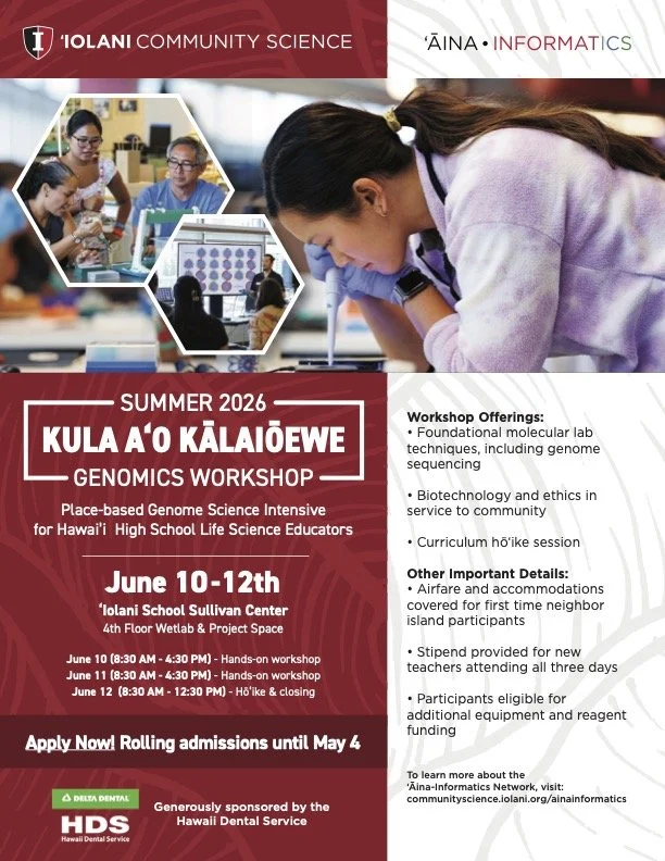Applications are now open for our annual Kula Aʻo Kālaiōewe Genome Science Intensive! Suited for high school life science educators, join us to learn foundational molecular lab techniques (DNA extraction, PCR, gel electrophoresis, and next-generation sequencing using the Nanopore MinION platform), biotechnology, and bioethics.